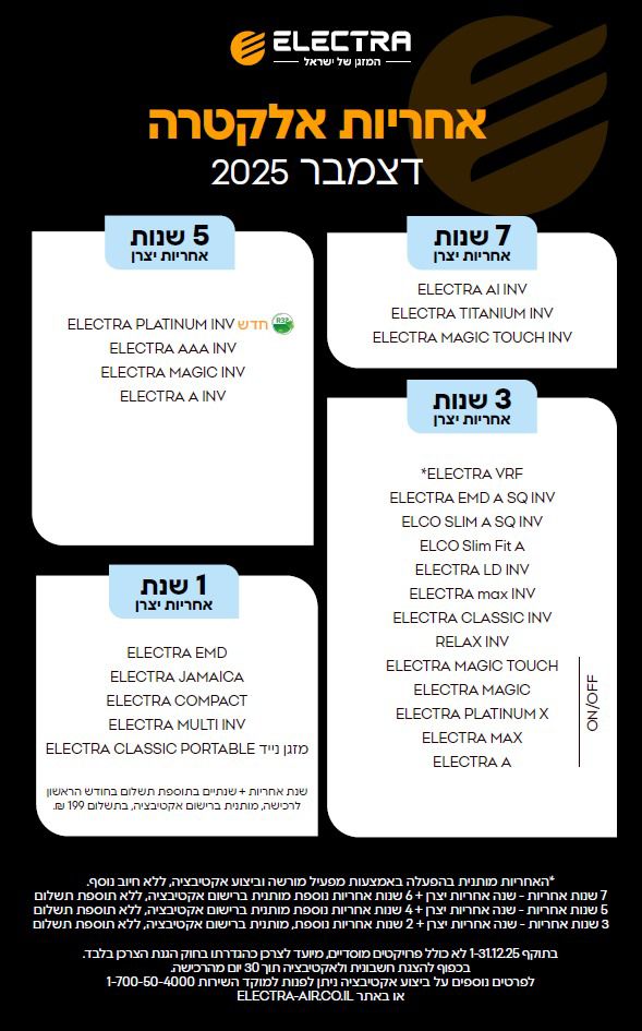 אחריות מזגני אלקטרה Electra |